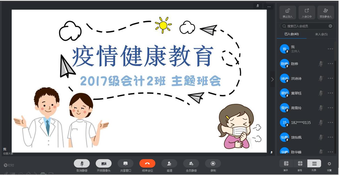 鉴于疫情防控期间的特殊情况,为了传递疫情防控思想,传达教育教学工作安排,与同学们进行思想沟通交流,17级会计2班于4月9日下午,利用网络钉钉会议平台开展了“疫情健康教育”线上主题班会。此次班会由班主任黄思萍主持,17会计2班全体同学参加签到。