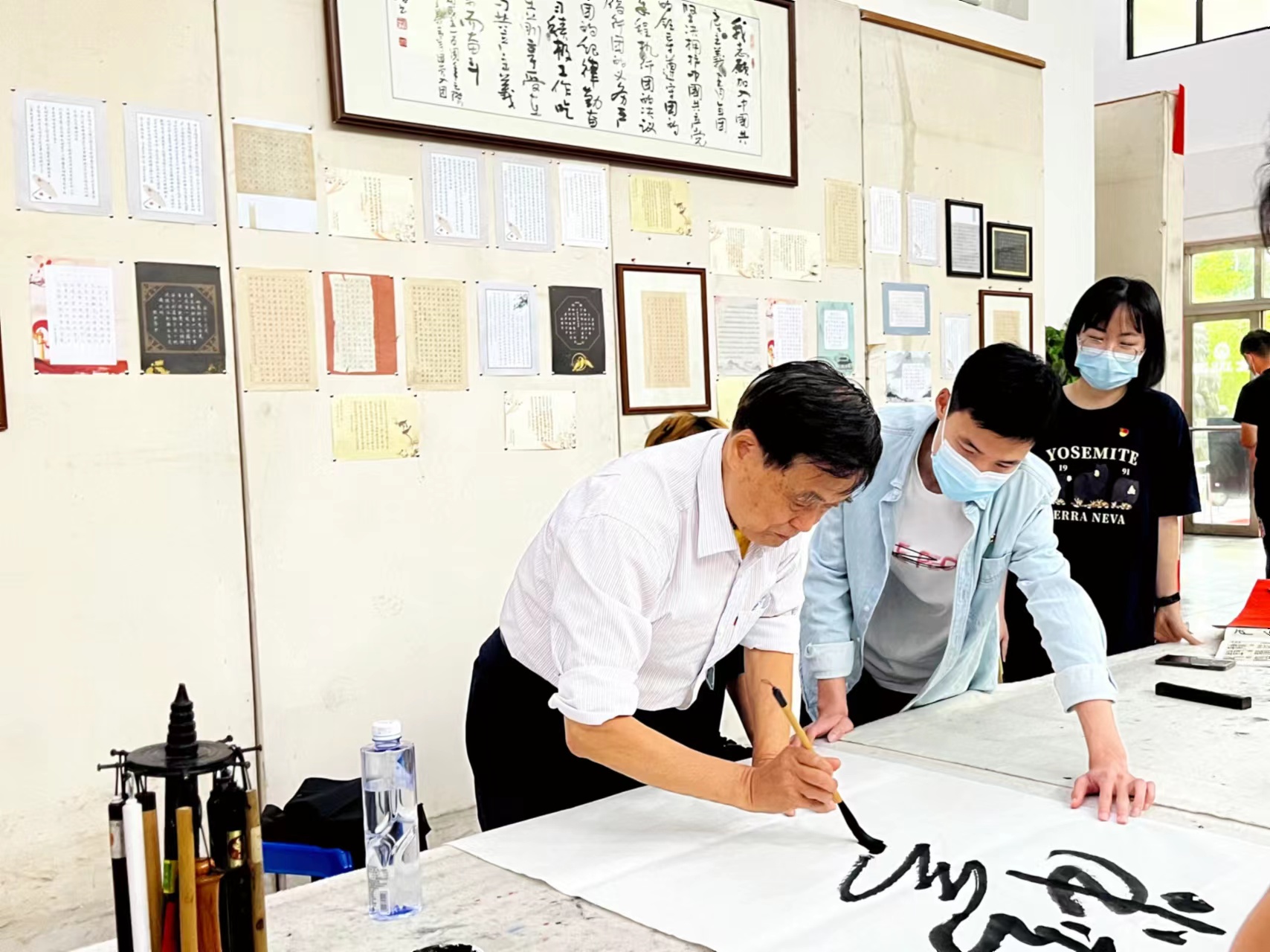 在老师的鼓励下,支部党员们纷纷上前学写书法,感受着书法带来的魅力, 用一笔一划去书写五四精神相关的历史人物、历史故事和经典语录。此情此景下,永远跟党走的旗帜在纸上飞扬,更在校园上空高高扬起,他们迎着新时代,正踏向新征程。
