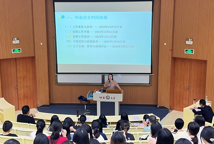 本次毕业论文启动会旨在使2024届毕业生提前了解毕业论文撰写的具体步骤与基本要求,确定毕业论文写作方向,使毕业论文撰写工作更加高效、顺利进行。会上,主讲人叶青老师就毕业生毕业论文总体工作安排进行了布置与说明,从撰写毕业论文的意义、写作流程、如何选题、论文撰写过程、审评标准、答辩及文献查阅等方面进行了详细讲解,主要包括毕业论文时间安排、毕业论文写作要求以及毕业论文学术诚信要求三大部分。