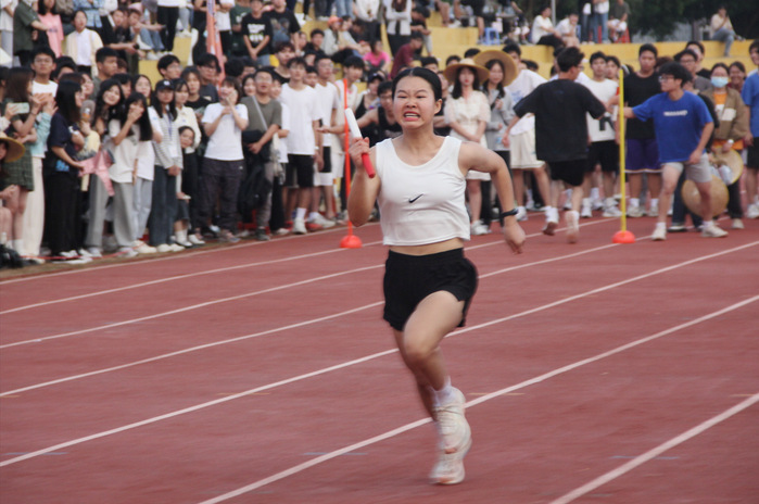 “其实也会有瓶颈期的,看到自己的成绩一直在掉,也会想我努力了为什么成绩还上不去,要不放一放?这时候就需要放松一下调整一下心态,和我的蒋妈妈聊聊天和别人说说话,听听音乐做点别的。”田径队的训练是枯燥的,也是会令人偶尔产生倦怠的。雨婷学姐的训练生涯中,唯一一次受伤是某次下楼梯导致的崴脚,听到这,令人哭笑不得。那次初愈后,她的状态无法迅速调整回来,测试成绩下滑严重。谈到这,雨婷学姐思量片刻后,她说:“或许我真的很喜欢跑步这项运动,或许因为队上的人,又或许是因为队上的氛围,那种大家一起训练一起为比赛努力准备的样子,一起相互鼓励欢呼呐喊的样子。当听到“连雨婷,加油!”的话语时,真的很振奋人心,我觉得我还可以冲,我还有力量,我还可以抬腿摆臂,我觉得所有的努力和汗水都是值得的。”学姐说,她是幸运的,在前进的路上,遇到了许多美好的人和事。但是这样感恩、自信、全力以赴的她,又何尝不是一个美好的人儿呢?